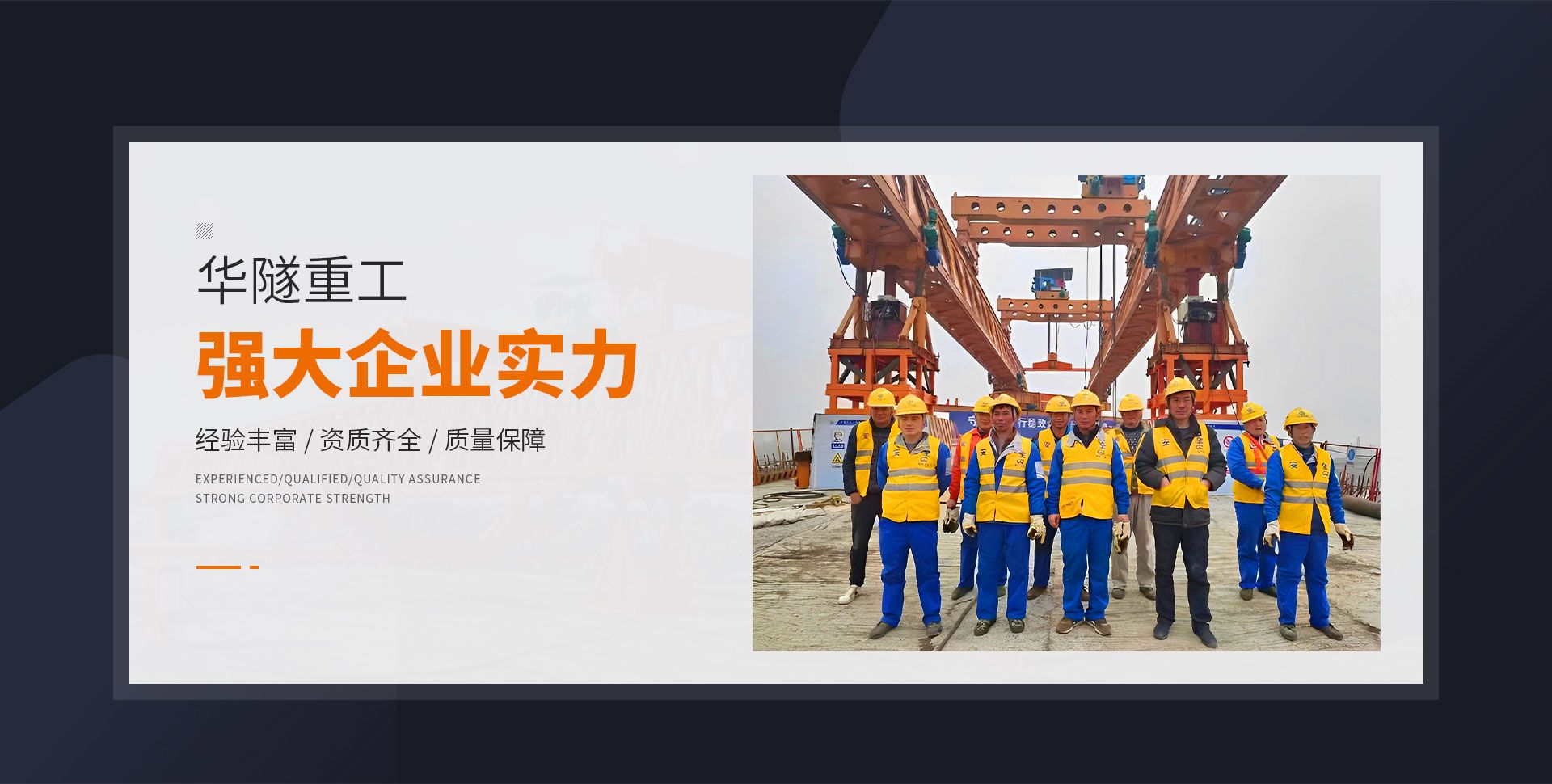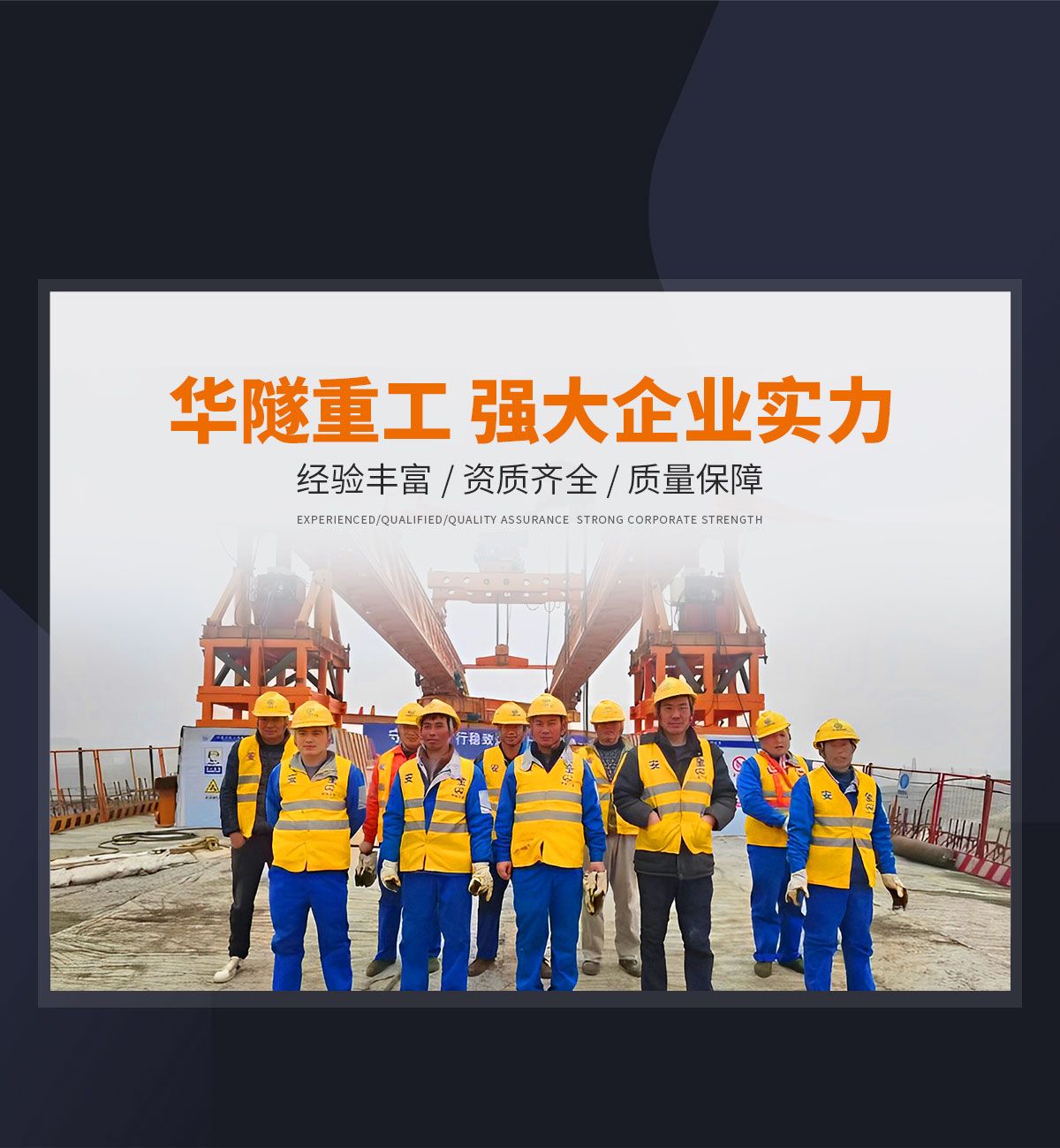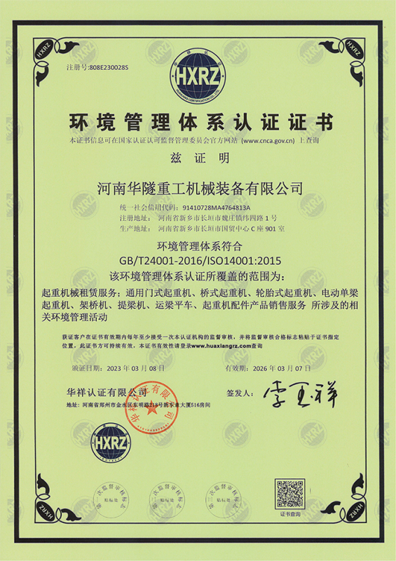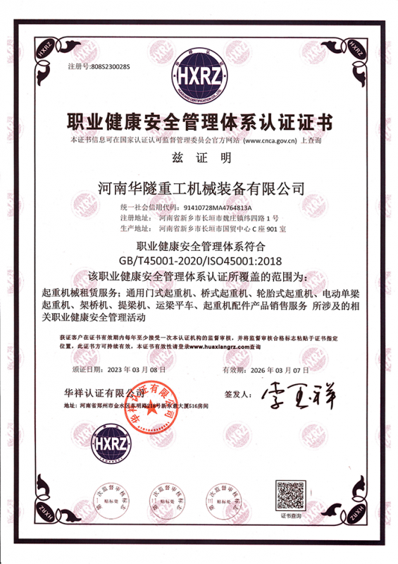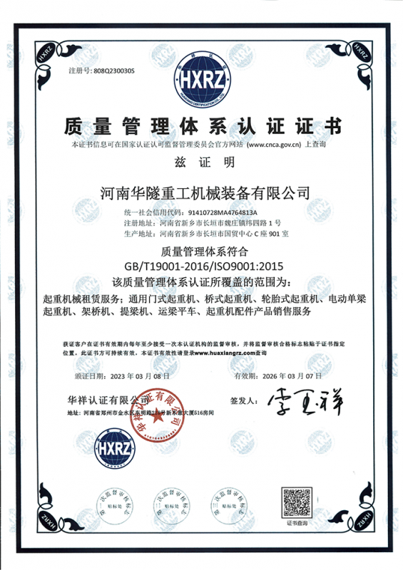 河南華隧重工機械裝備有限公司主要從事通用門式起重機、橋式起重機、電動單梁起重機,輪胎式起重機、架橋機、提梁機、遠梁平車、鋼絲繩電動萌蘆、卷揚機、起重配件制造、銷售:起重機械租賃、安裝和維修,起重設備園收,機械設備維修,鋼結構工程承包,橋梁工程及技術咨淘服務,銷售五金制品、機電設備:建設工程監理,建設工程設計,各類工程建設活動,建筑勞務分包,建筑物折除作業,施工作業,工程管理服務,土石方工程施工,裝如發運。  公司已通過IS0國際質量、環境、健康與安全三合一標準認證,特種設備制造許可證和特種設備安裝改造維修許可證。擁有完熟的質量管理體系。嚴格的管理制度,強大的生產能力和先進的檢測手段,在保證產品質量的同時,也具備了極強的市場競爭力。  公司堅持科技創新為理念,產品質量為核心,注重信譽,建立了減信可靠、快捷、思速。便利周到的售后服務網絡。  我們擁有的技術專家和技術服務隊伍為客戶提供充善的售前技術支持和全天候的售后服務體系,讓您無后顧之憂,享受一站式的超值服務?!  叭A隧重工,伴您成功“是華隧重工永遠的宗指,真被的希望與各界朋友攜手并進。共創輝準!